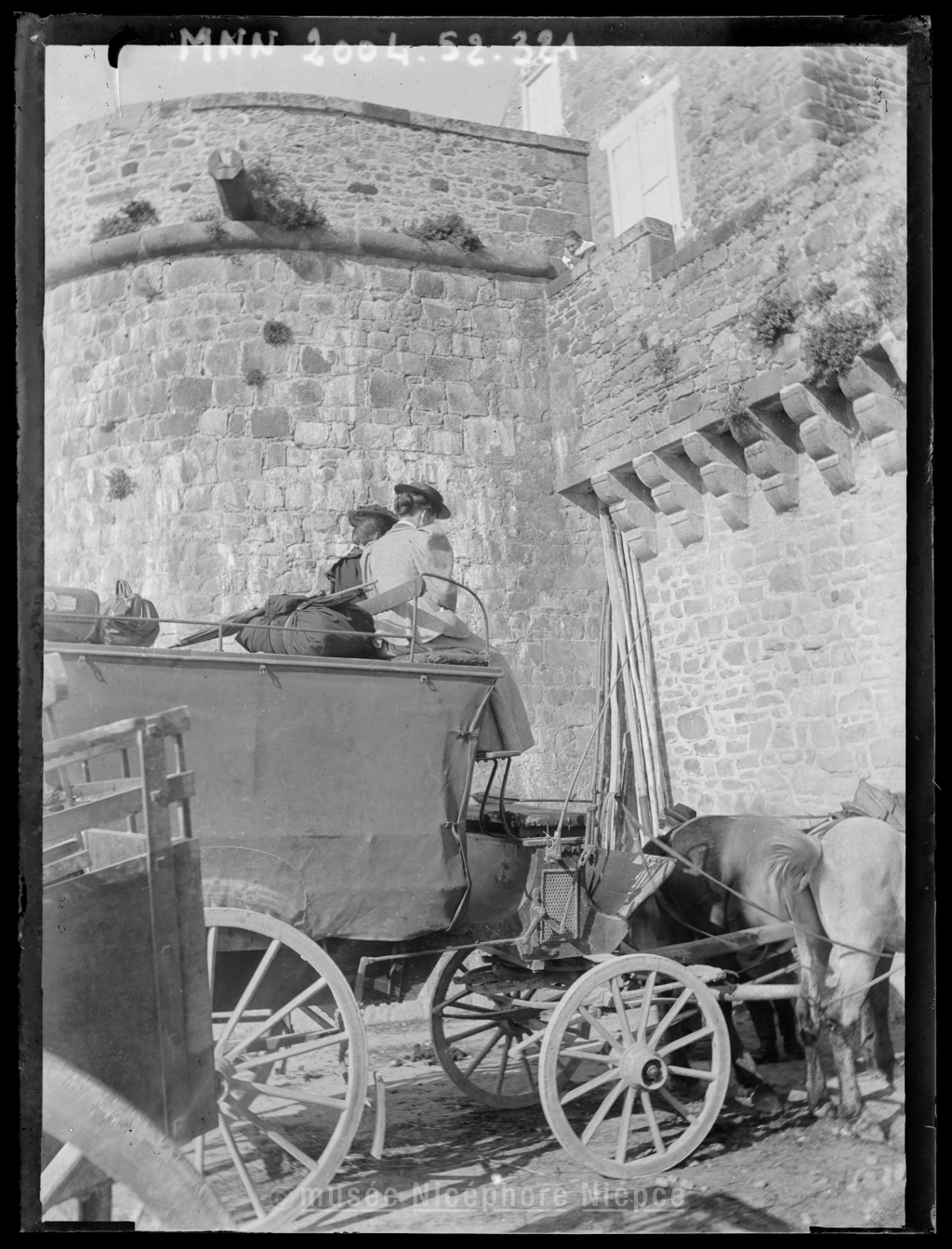 Une voiture à cheval au pied des remparts