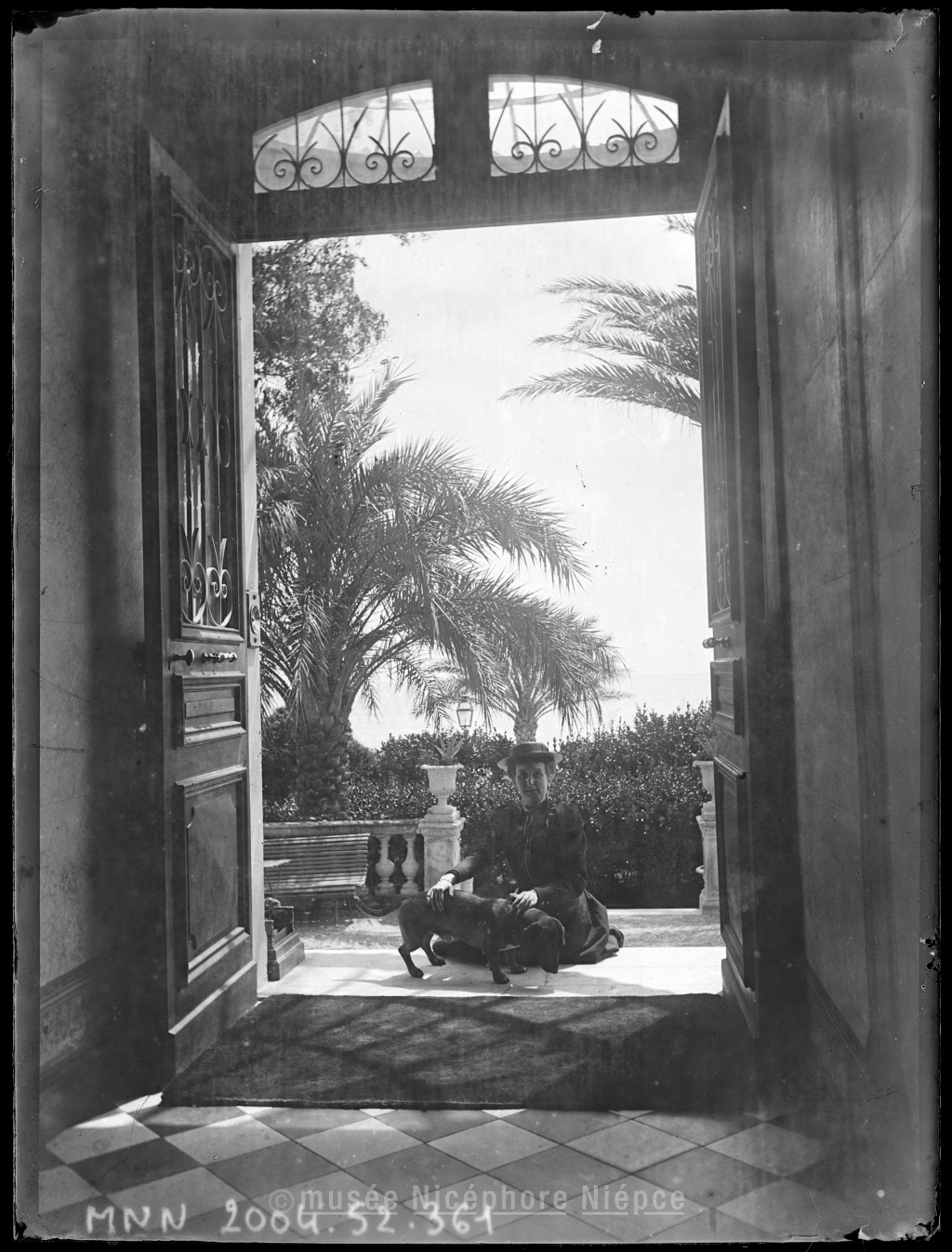 Mme Demachy accroupie devant un chien à l'entrée de l'hôtel Gonnet à Cannes