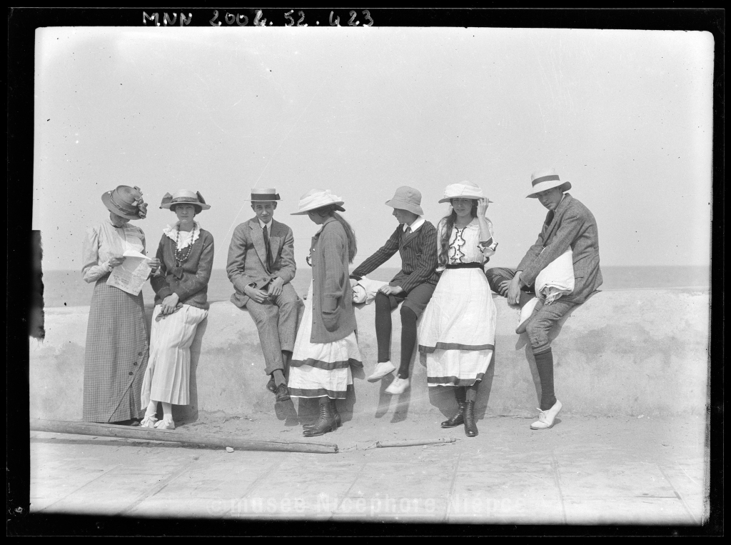 Groupe de jeunes gens (dont Bob, Jack et les jumelles Seillière ?) sur le bord de mer à Villers
