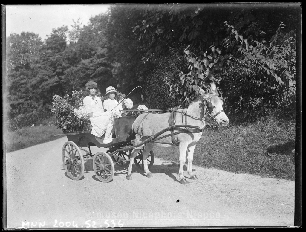 Deux enfants assises dans une voiture tirée par un âne dans un jardin
