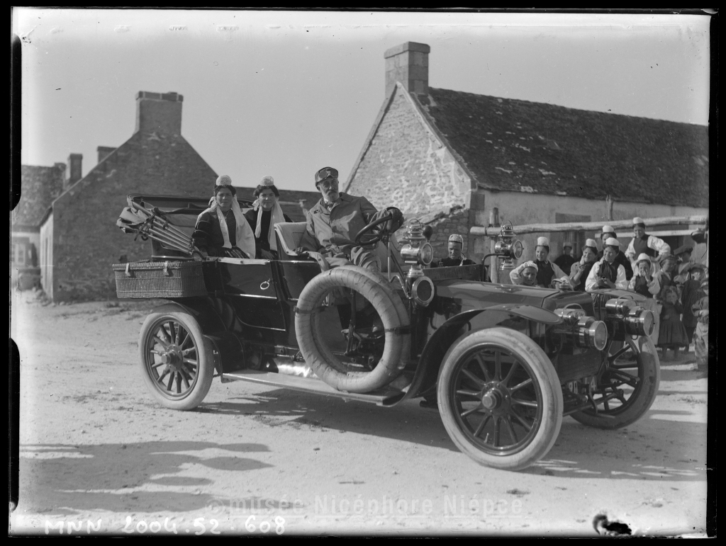 Robert DEMACHY posant avec deux bretonnes dans son automobile
