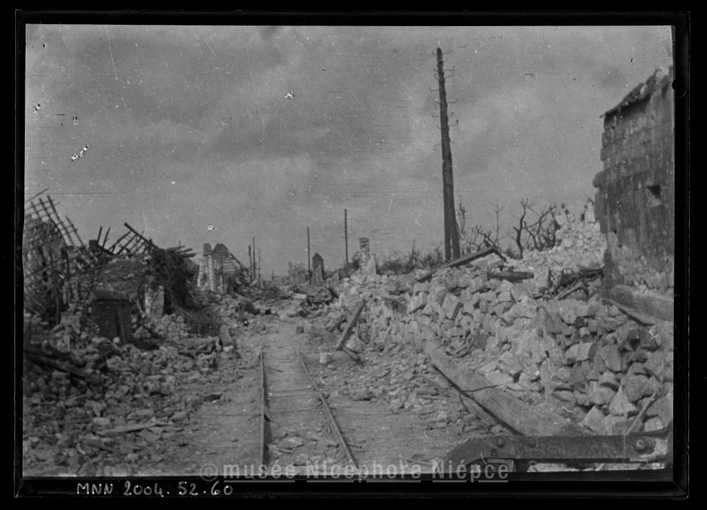 Une ville en ruines près du front (négatif obtenu d' après une photographie du front réalisée par Bob Demachy)