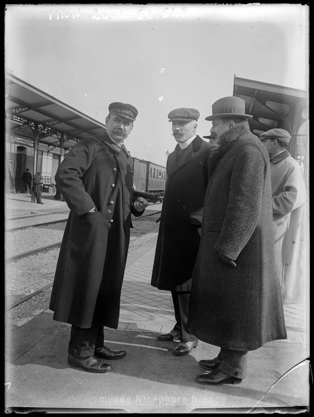 Trois hommes sur le quai dune gare