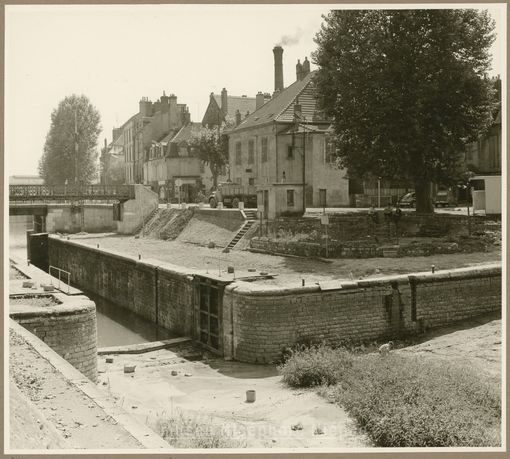 Ancien bassin du canal du centre : commencés fin juin 1959, les travaux de comblement du bassin sont menés activement tout au cours de l'été L'écluse et le pont des Fainéants ; et le début de la Grande rue St-Cosme 18 Août 1959