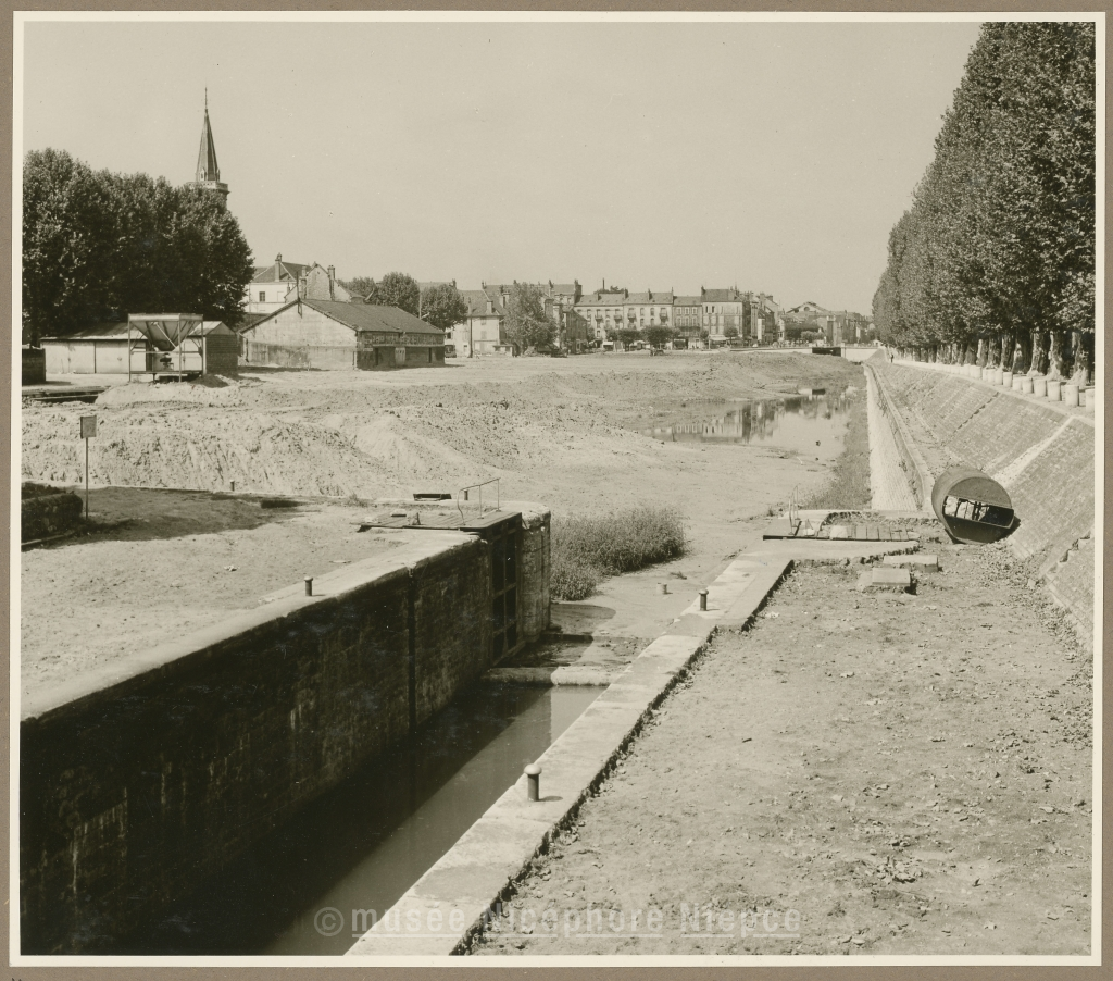 Ancien bassin du canal du centre : commencés fin juin 1959, les travaux de comblement du bassin sont menés activement tout au cours de l'été Vue prise du pont des Fainéants, en direction du Nord-Ouest 18 Août 1959