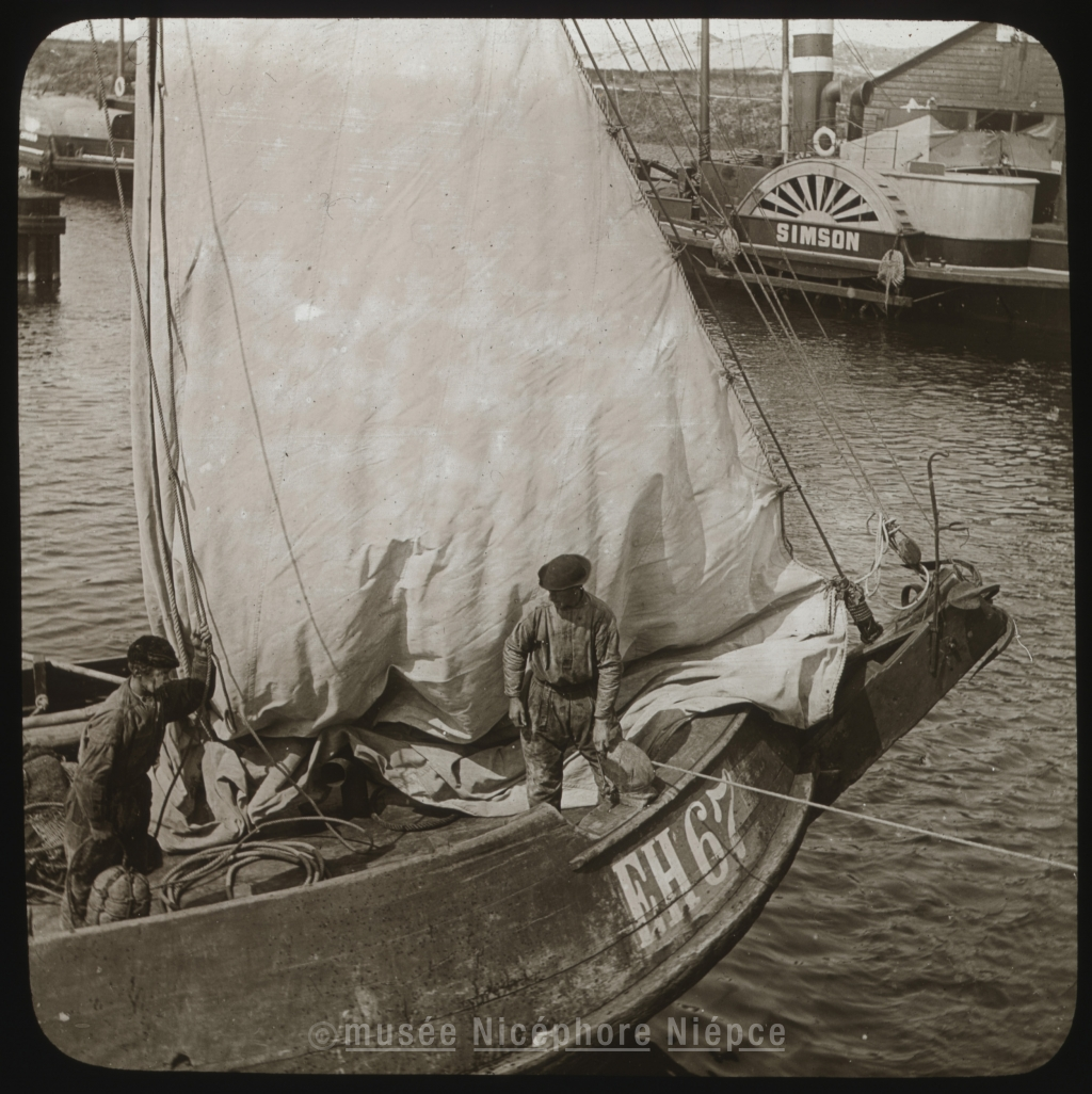Pêcheurs à bord de leur bateau dans un port hollandais