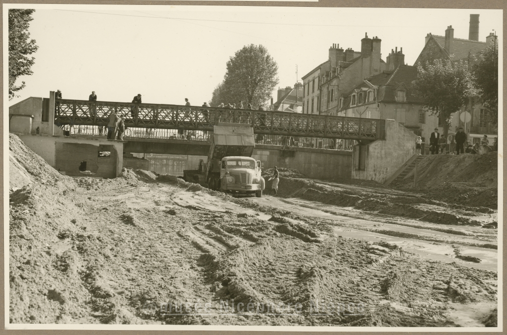 Comblement de l'écluse du pont des Fainéants : passerelle et pont tournant 12 octobre 1959