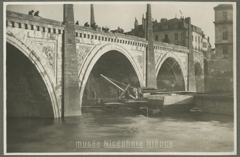 vue d'architecture - Chalon-sur-Saône - rivière - pont - péniche - accident de transport - secours - personnage - Abel LACOSTE