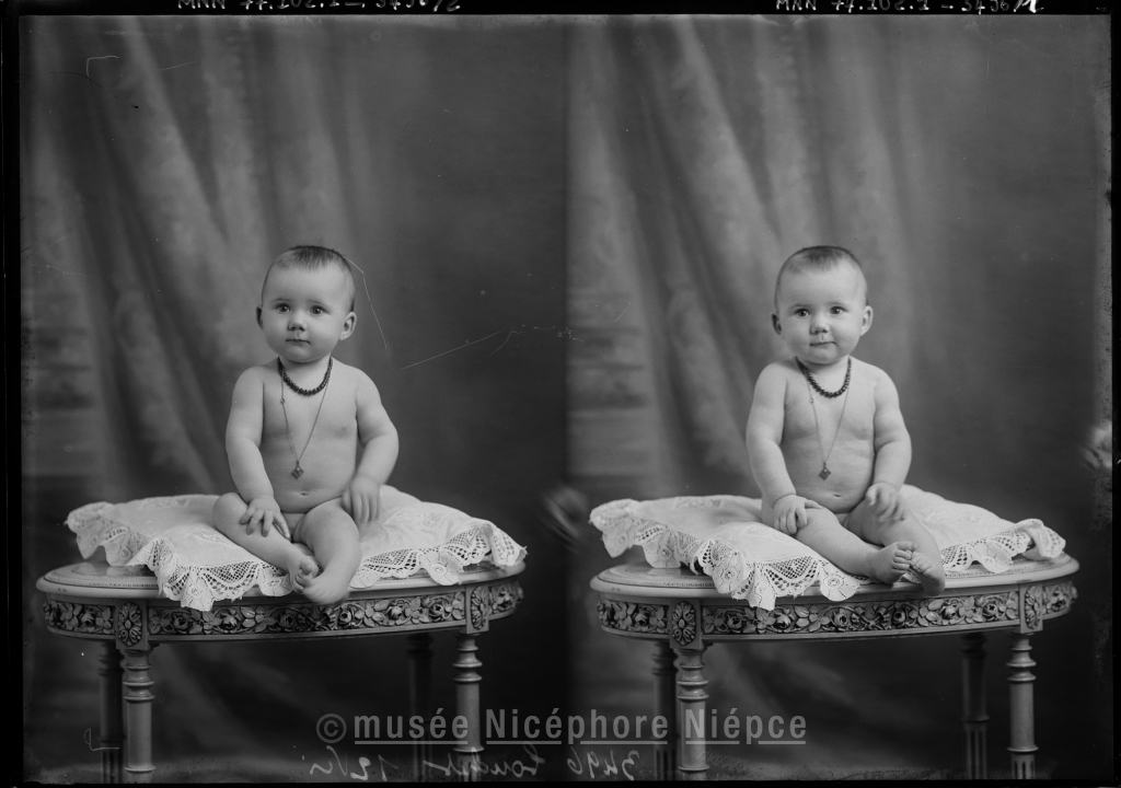 assis - portrait - en pose - fond peint - bébé - guéridon - coussin - Germain EBLE