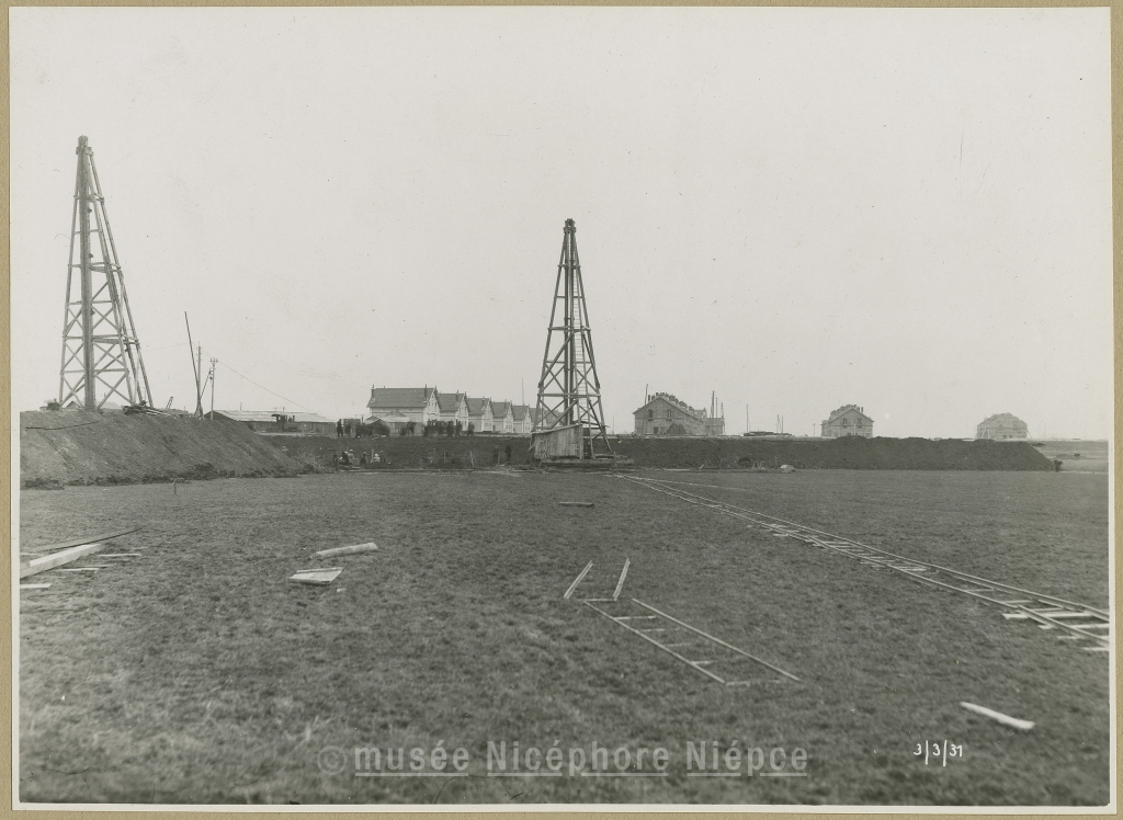 Travaux de la future usine de l"'Air liquide" : remblayage et enfonçage des pieux.- Au second plan, maisons ouvrières nouvellement construites par la Ste "Formo-Centre". 3 Mars 1931