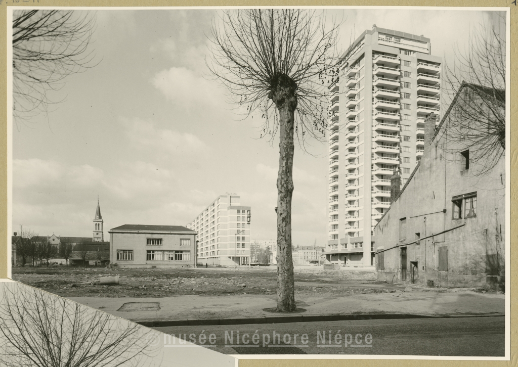 Grande rue St Cosme. Démolitions de maisons et aplanissement du terrain, pour permettre l'implantation de la Maison de la Culture.