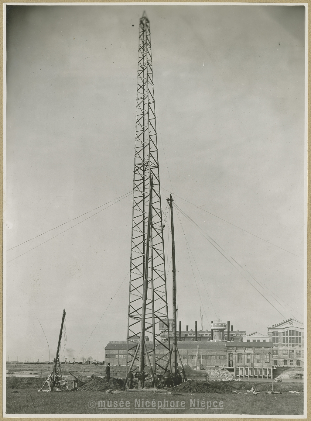 Usine centrale thermique de la "Ste Formo-Centre" ; mise en place d'un pylone de la ligne à haute tension qui doit traverser la Saône 28 Mars 1931