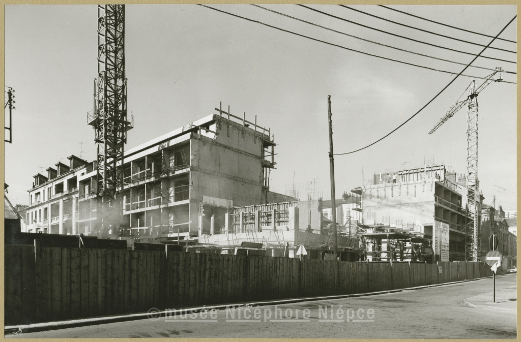 Les bâtiments de la "Banque Populaire de S. et L. et de l'Ain" commencent à s'élever à l'angle de la rue du 11 Novembre 1918 et de la rue de l'Asile Octobre 1971