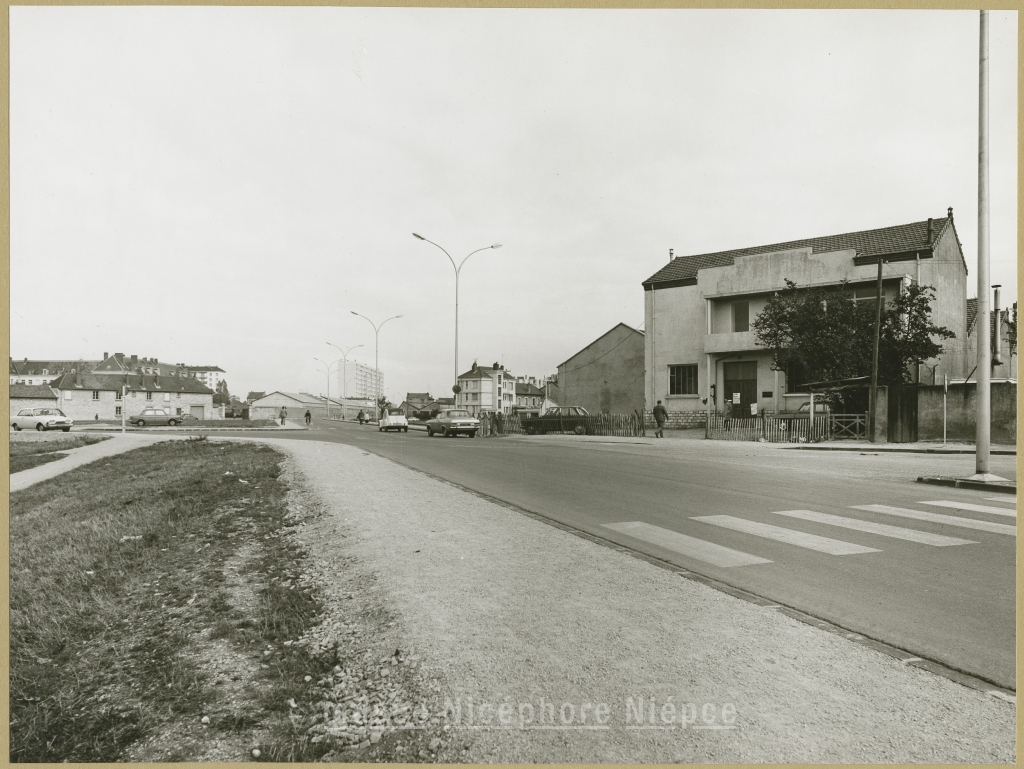 Elément de la future "rocade" : l'avenue du 134ème R.I. au croisement avec la rue Gl Duhesme à droite, l'imprimerieBOURGEOIS (à disparaître) Octobre 1972
