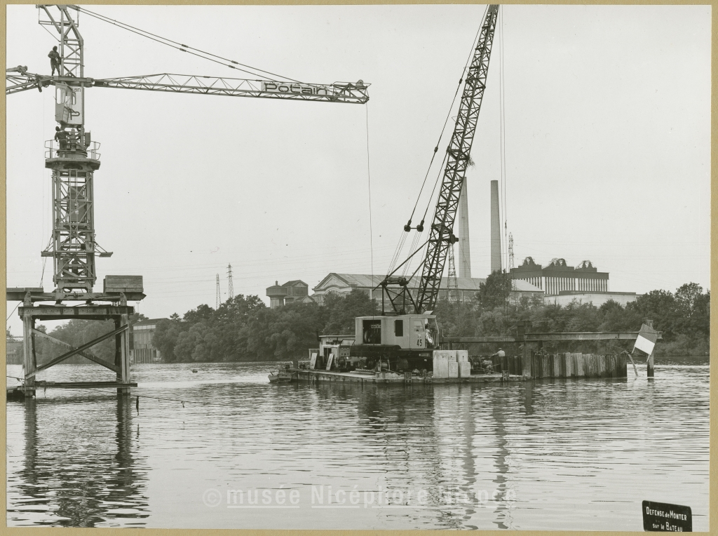 Futur Pont Sud sur la Saône : début des travaux en octobre 1973 Vue prise de la rive droite ; la centrale Thermique
