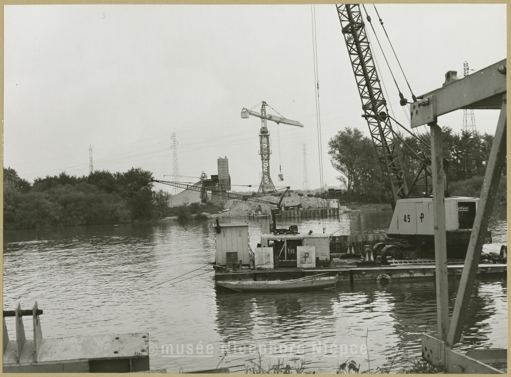 Travaux du Pont-Sud sur la Saône, début octobre 1973 vue prise rive droite, en amont : (dans le lointain, le clocher de St-Marcel)