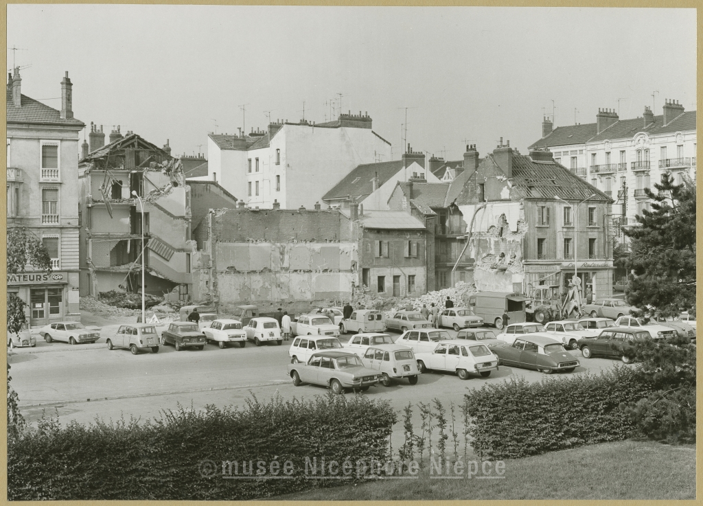 Aménagements du Quartier St-Cosme : démolitions des vieilles maisons entre rue Rougeot et av. Jean Jaurès pour permettre la construction du grand immeuble "Le Palma" Octobre 1973