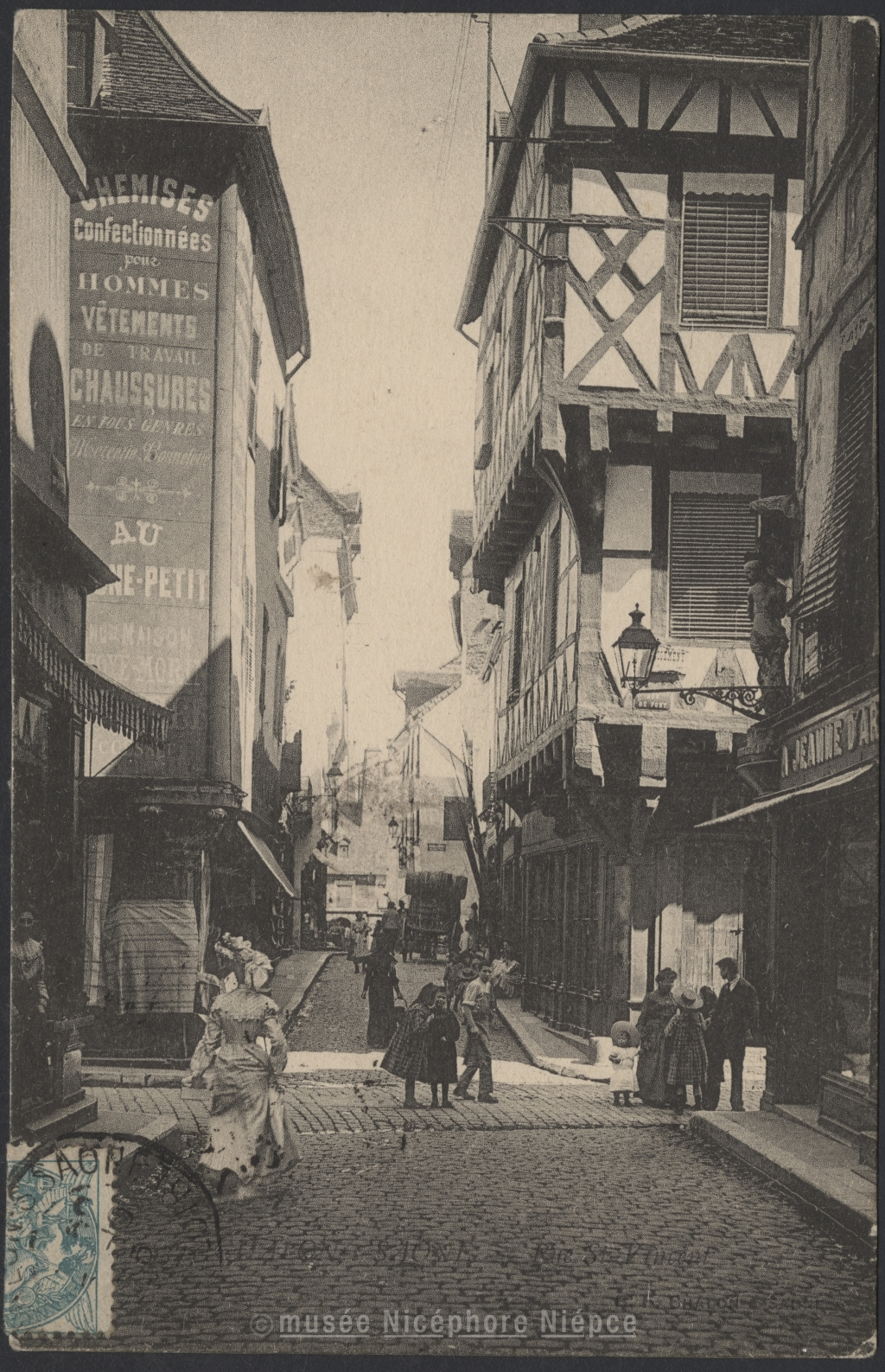 vue d'architecture - Chalon-sur-Saône - scène - homme - enseigne - enfant - chapeau - femme - maison - statue - magasin - rue - pavé - charrette - tonneau - discussion - saint - apprenti - BOURGEOIS Frères