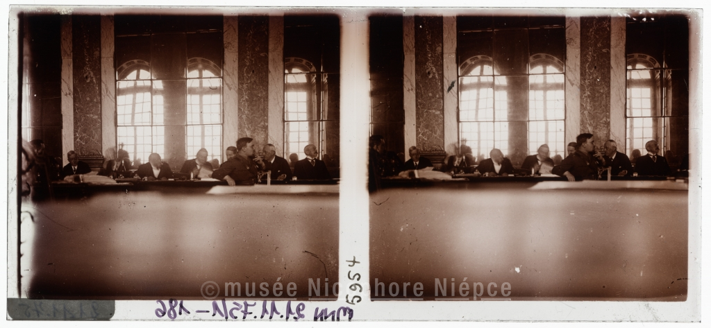 VERSAILLES - LA GALERIE DES GLACES / LA SIGNATURE DE LA PAIX / Le Lieutenant Mantoux, interprète de la Conférence, traduisant / le Traité de Paix aux délégués allemands. Au fond, MM. Wilson, / Clémenceau et Lloyd George.