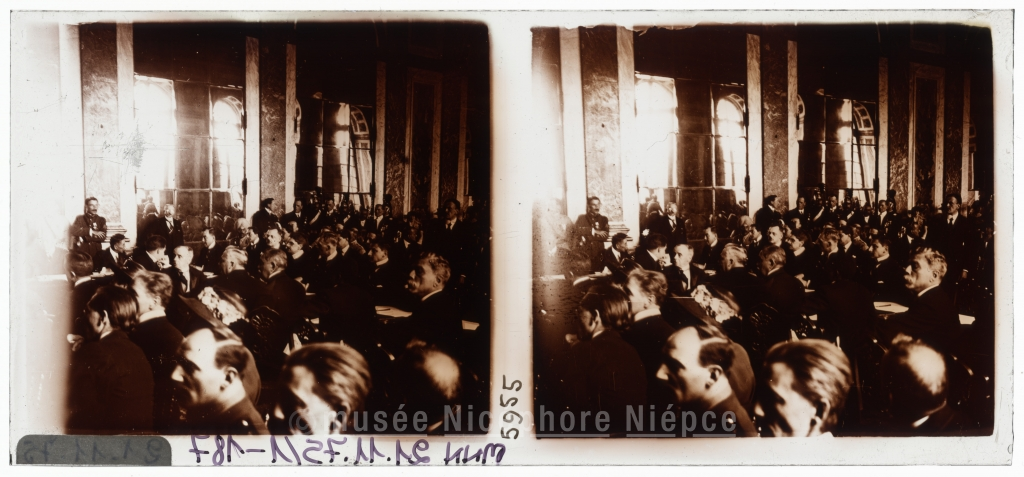 VERSAILLES - LA GALERIE DES GLACES / LA SIGNATURE DE LA PAIX / Les délégués allemands, MM.Bell et Muller écoutant la traduction / du document.
