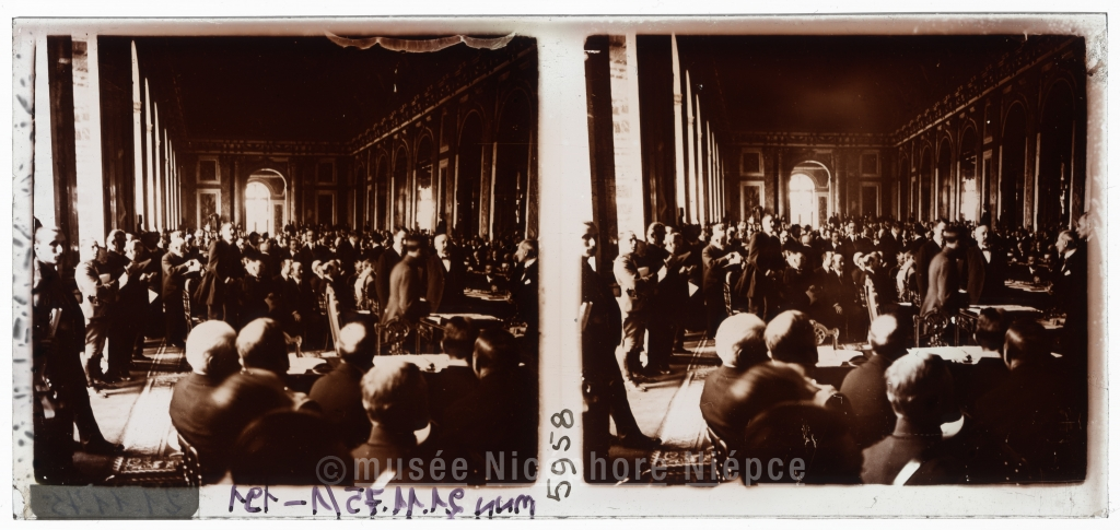 VERSAILLES - LA GALERIE DES GLACES / LA SIGNATURE DE LA PAIX / La table de la signature. - M. Dutasta, secrétaire général de la / Conférence présentant le traité aux délégués.