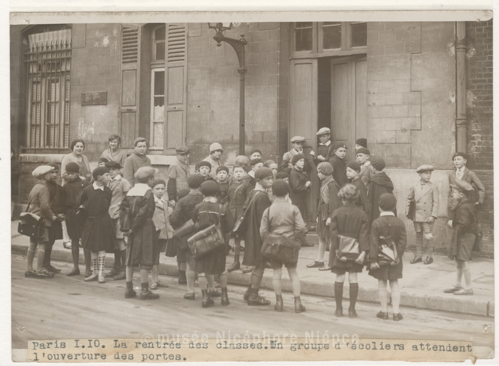 Paris 1.10.1930. La rentrée des classes / un groupe d'écoliers attendant l'ouverture des portes