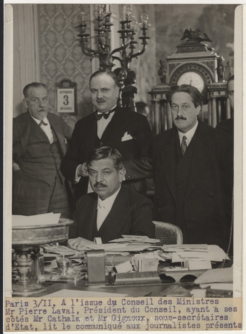 Paris 3 novembre 1931. A l'issue du Conseil des Ministres, / Monsieur Pierre Laval, Président du Conseil, ayant à / ses côtés Monsieur Cathala et Monsieur Gignoux, sous-/ secrétaire d'Etat, lit le communiqué aux journalistes / présents