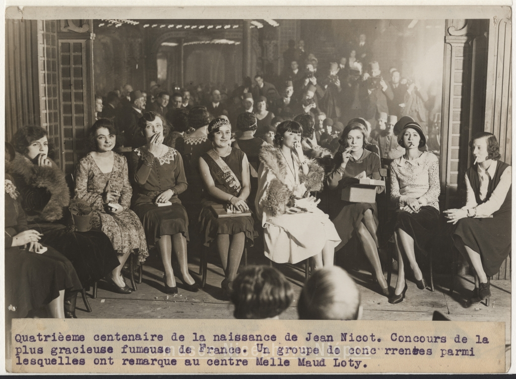 Quatrième centenaire de la naissance de Jean Nicot. Concours de la plus gracieuse fumeuse de France. Un groupe de concurrentes parmi lesquelles ont remarque au centre Melle Maud Loty.