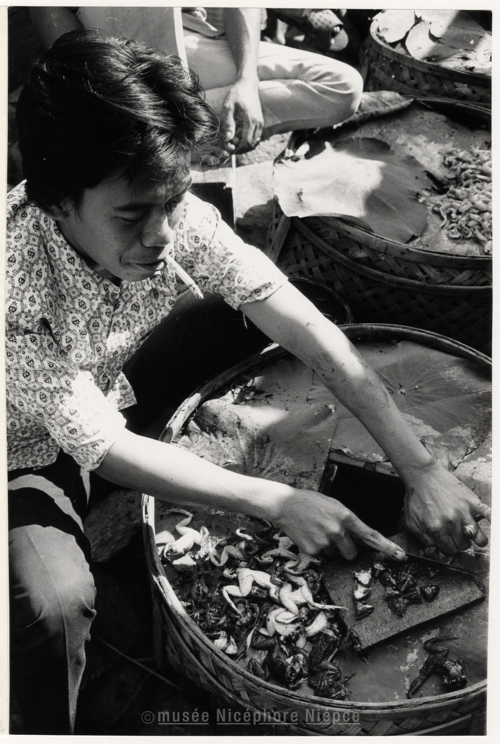 Homme asiatique découpant des grenouilles