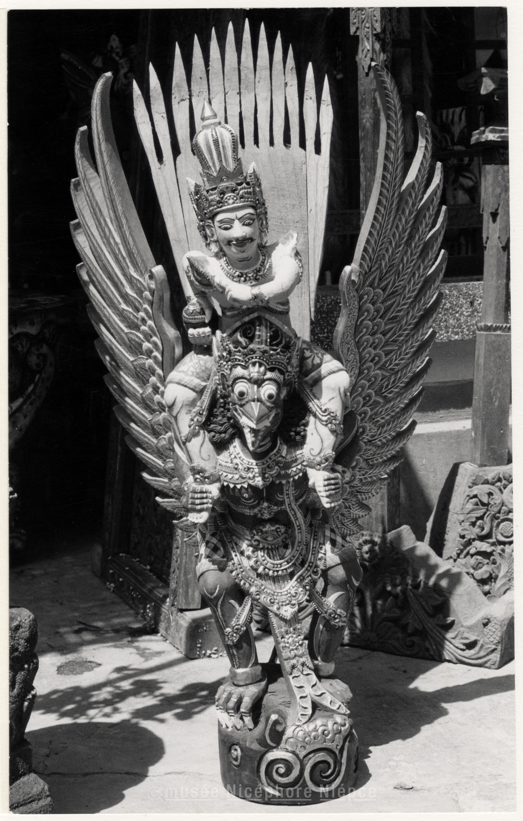 Sculpture hindou en bois peint : Visnu sur sa monture Garuda