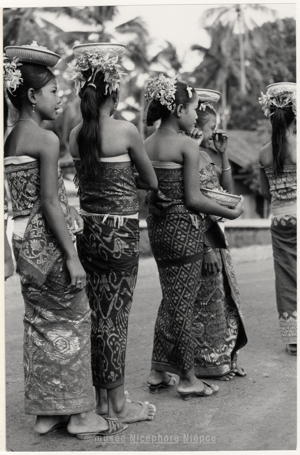 Jeune filles asiatiques portant des offrandes sur la tête