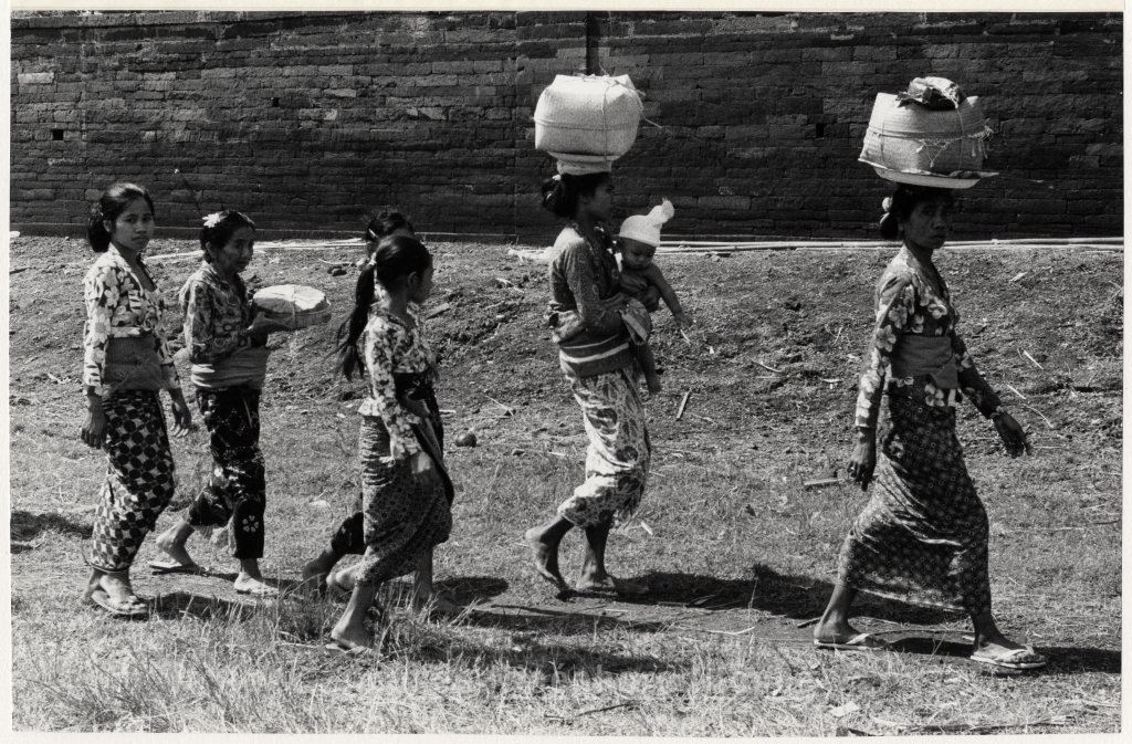 Femmes et jenes filles asiatiques marchant, dont deux portent un paquet sur la tête