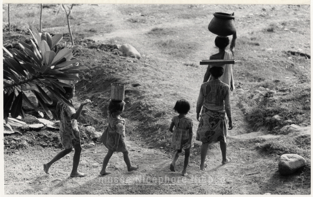 Femmes et fillettes asiatiques marchant, portant des récipients sur la tête