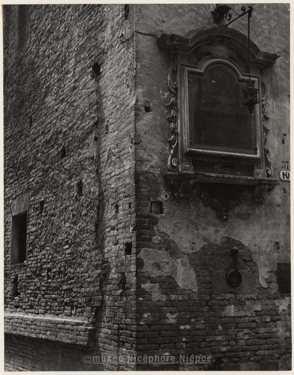 Plaque ornementale, ouvragée, contre un mur de maison