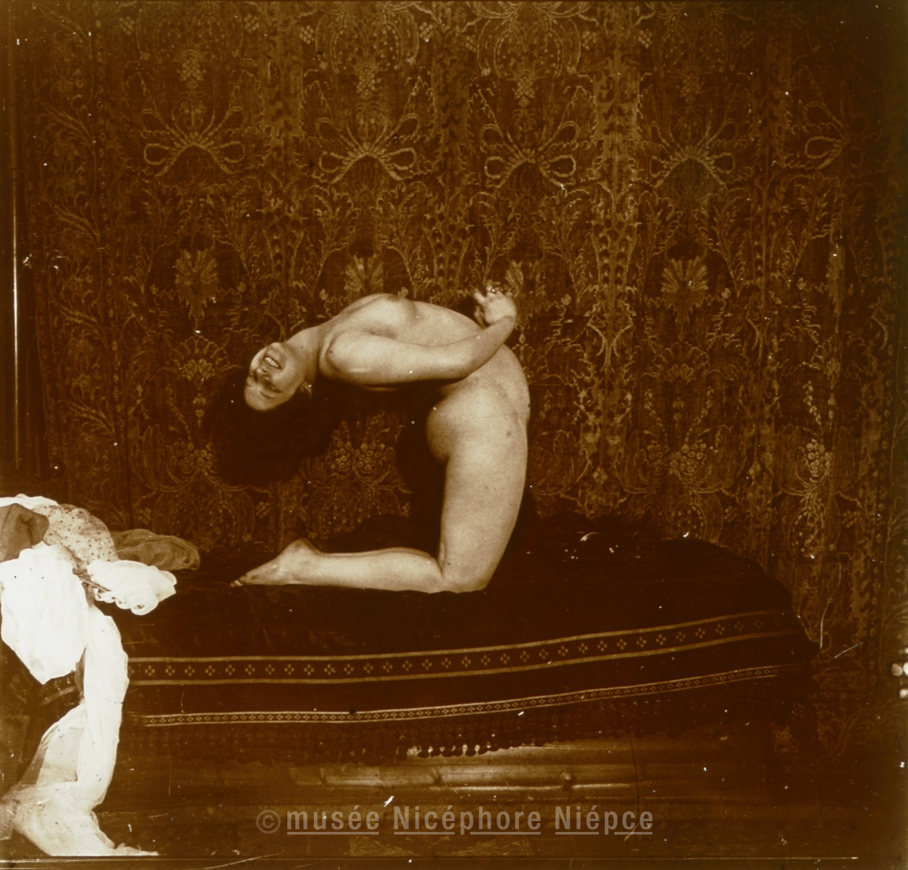 Femme nue se contorsionnant devant une tenture