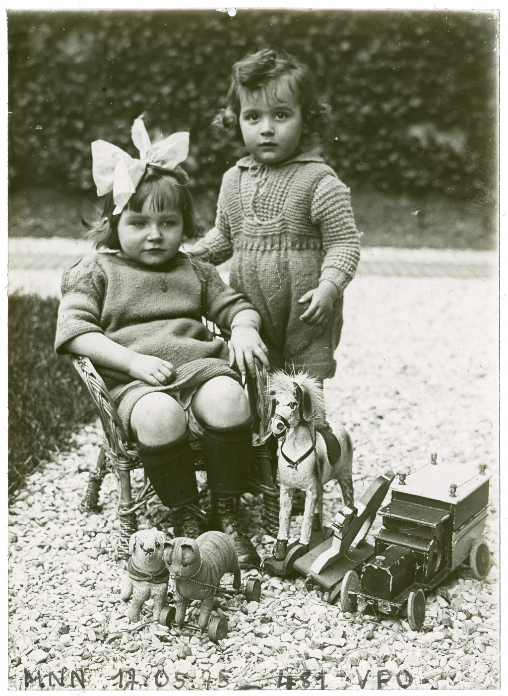 Deux enfants avec leurs jouets dans une cour