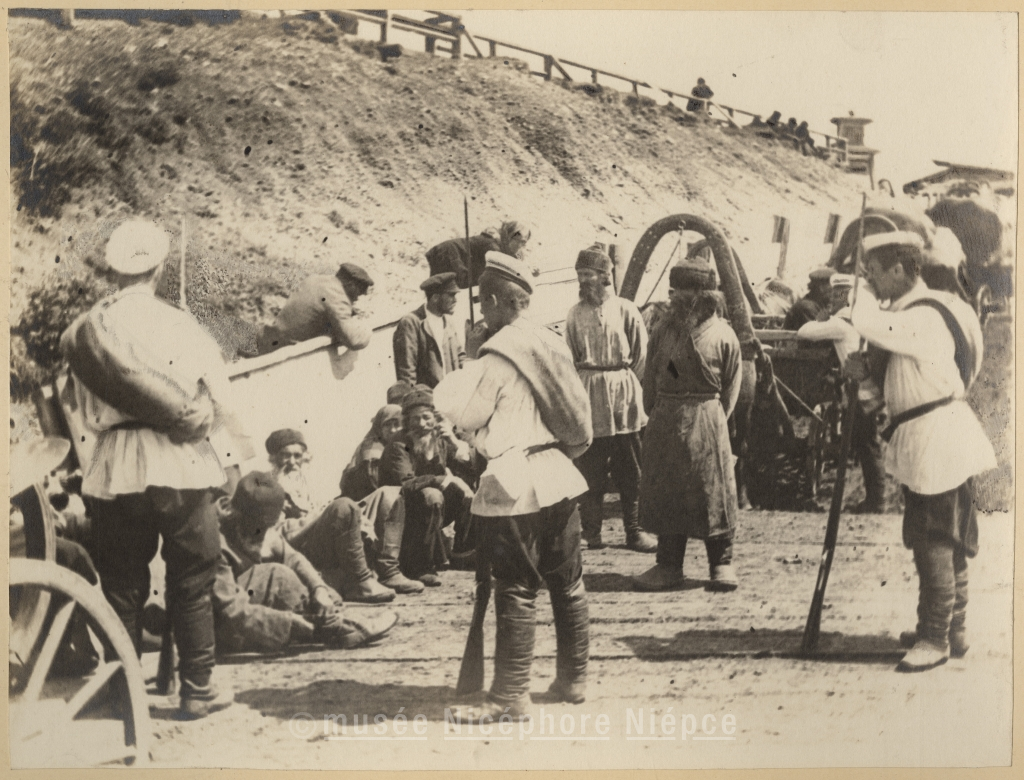 Ouvriers russes lors d'une pause, encadrés par des soldats