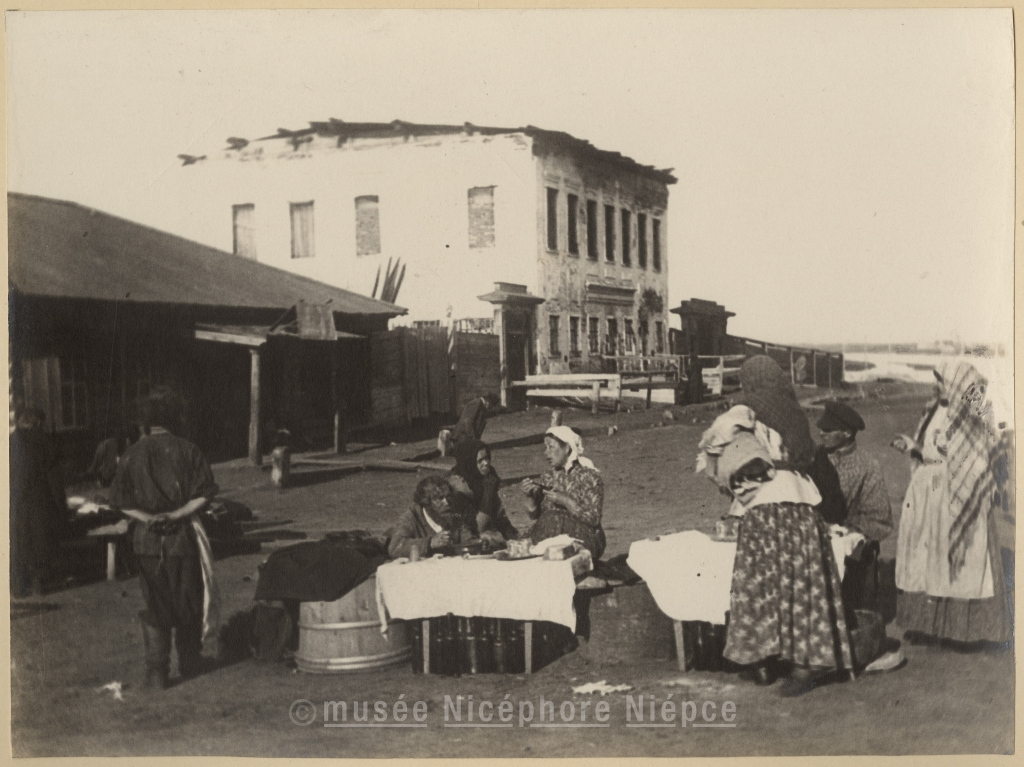 Hommes et femmes russes prenant leur repas sur la place d'un village