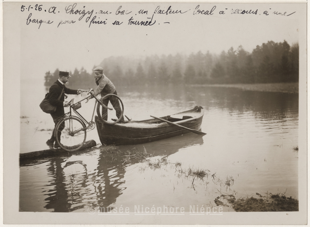 Les inondations dans l'Oise / A choisy-au-Bac un facteur local a recours / à une barque pour finir sa tournée