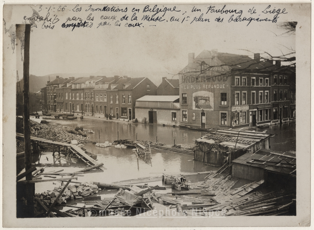 Inondations en Belgique - Un faubourg de Liège envahit par les / eaux de la Meuse. Au 1er plan des baraquements / en bois emportés par les eaux