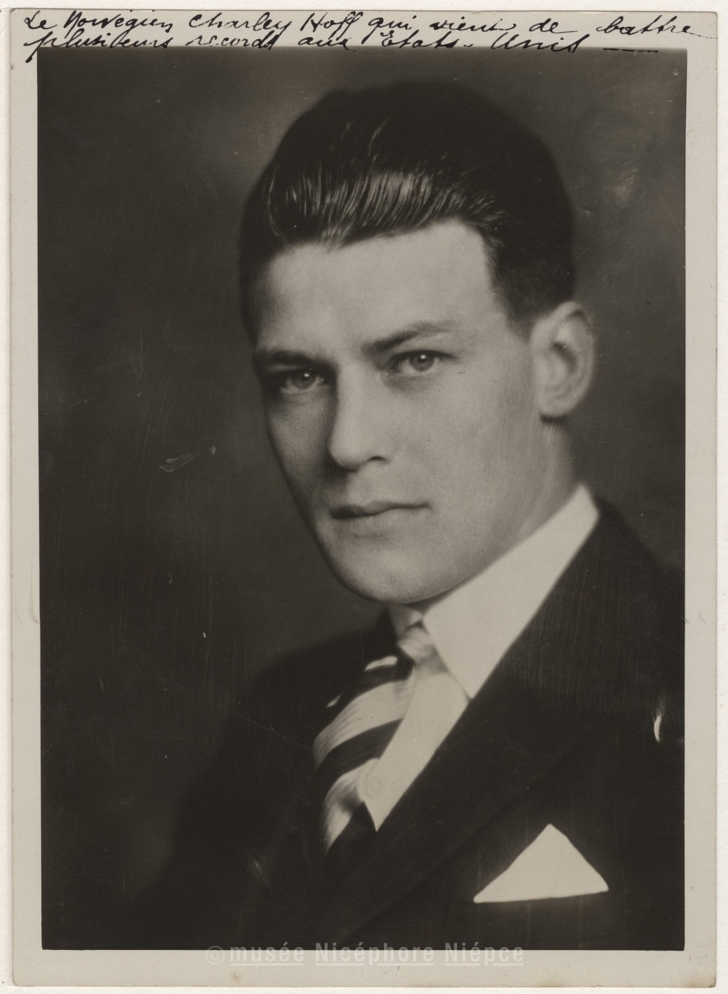 Portrait de l'athlète Norvégien / Charley Hoff qui vient de battre / plusieurs records aux Etats-/Unis