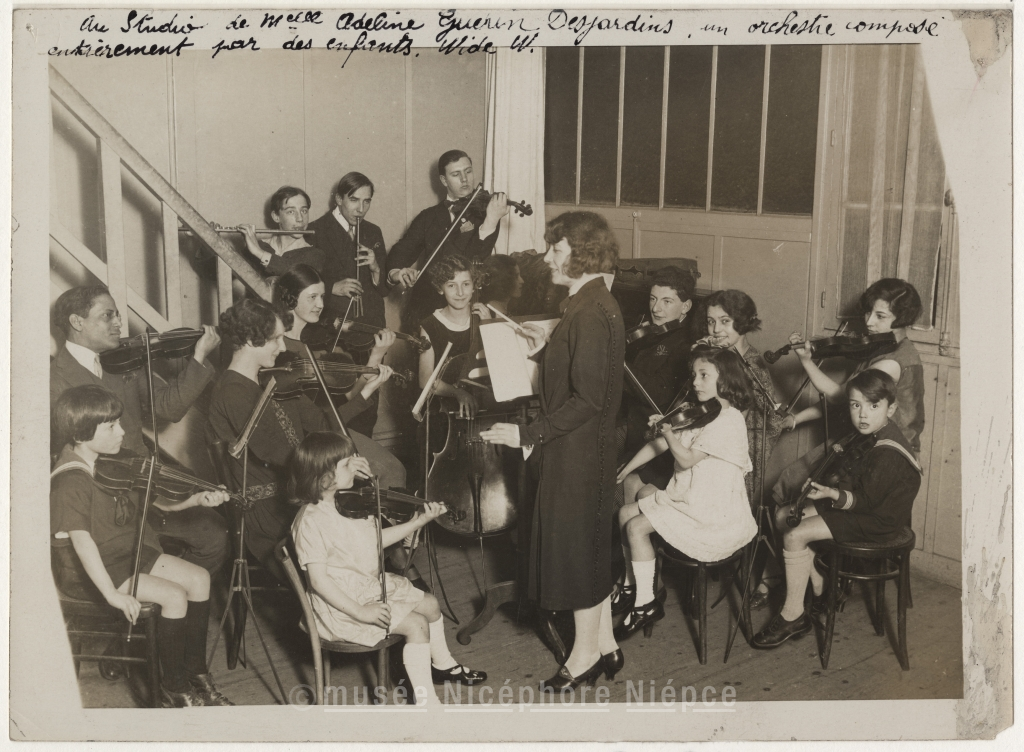 Au studio de Mlle Adeline / Guerin Desjardins, violoniste / bien connue, un orchestre composé entièrement par des / enfants dont le plus jeune / a 5 ans et le plus âgé / 18 ans