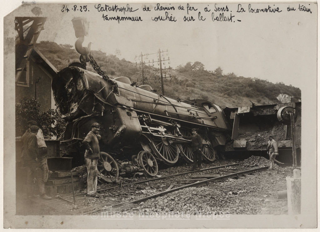 Catastrophe de chemin de fer à Sens / La locomotive du train tamponneur couchée / sur le ballast