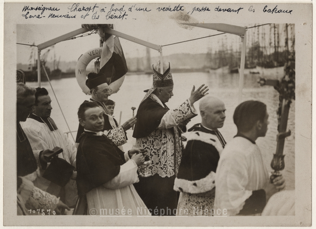 St-Malo - Pardon des Terre Neuvas / Monseigneur Charost, à bord d'une vedette, / passe devant les bateaux et les bénit