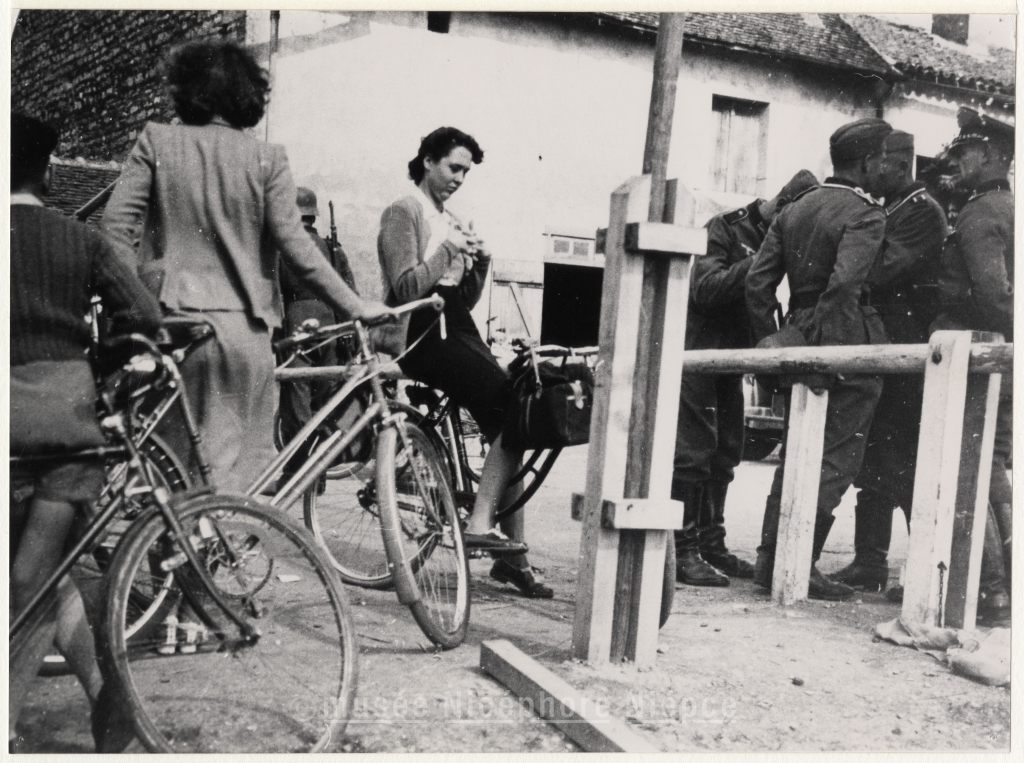 Soldats allemands et civils au poste de la ligne de démarcation, à Chalon-sur-Saône