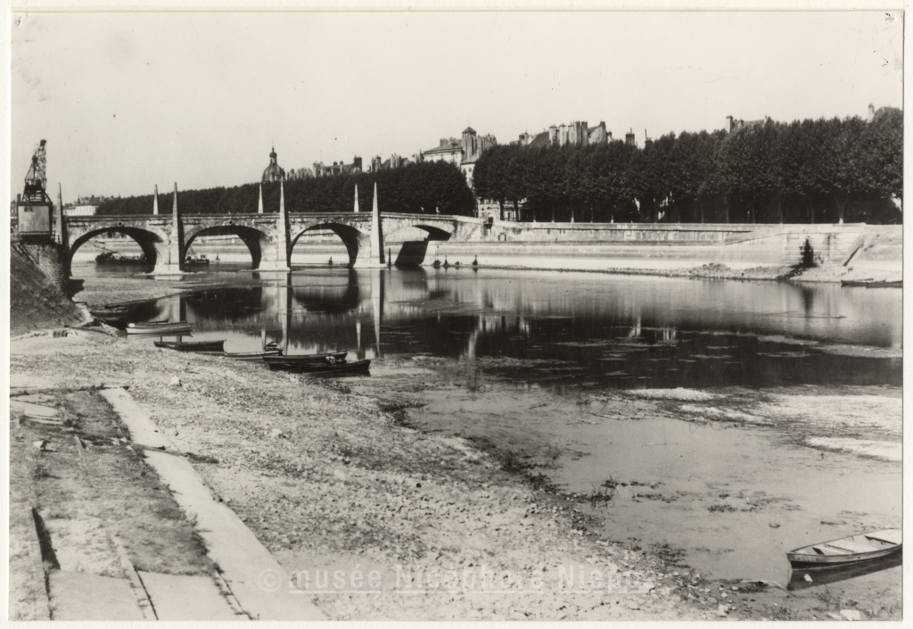 Vue de la Saône à bas niveau et du pont Saint-Laurent,