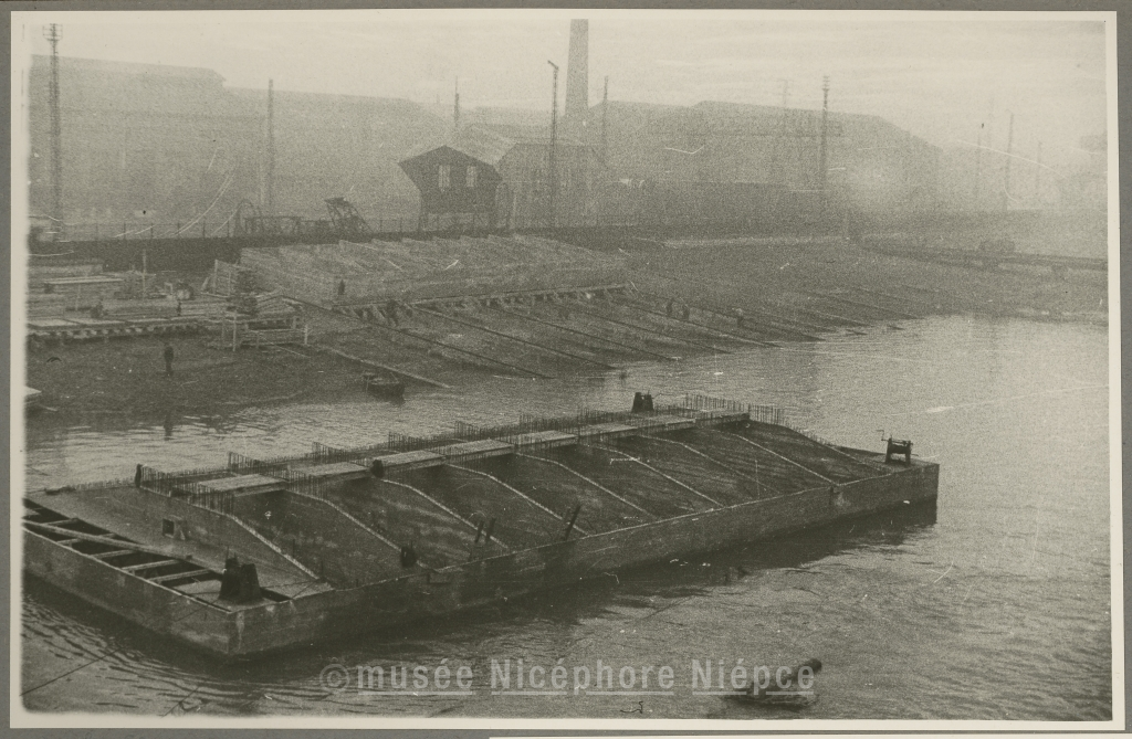 Construction aux Chantiers Schneider et mise à l'eau des soubassements des deux futures piles du nouveau pont Jean Richard Janvier 1950