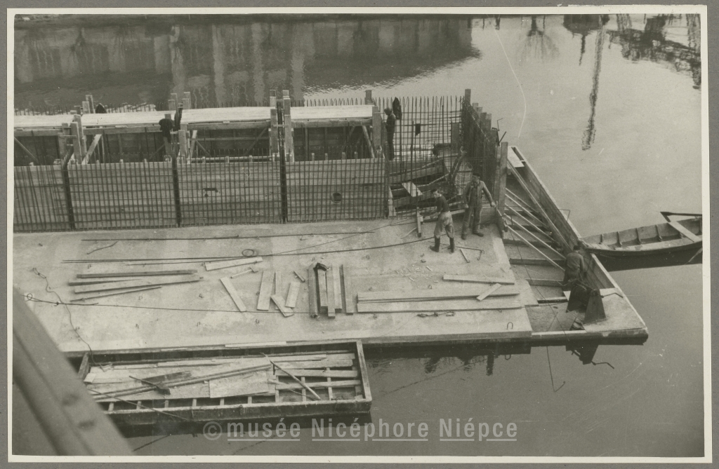 Mise en place du soubassement et commencement de la construction d'une pile du futur pont Jean richard 25 Mars 1950