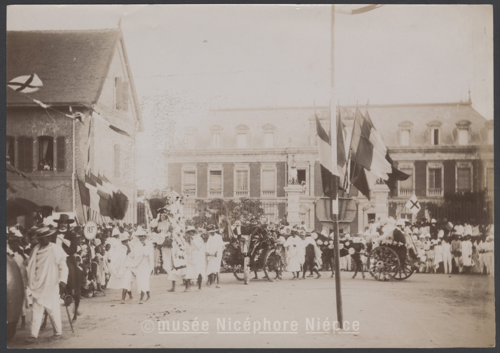 scène - foule - drapeau - maison - fête - charrette - français - défilé - France - Madagascar - Malgache - Anonyme - CHUSSEAU-FLAVIENS