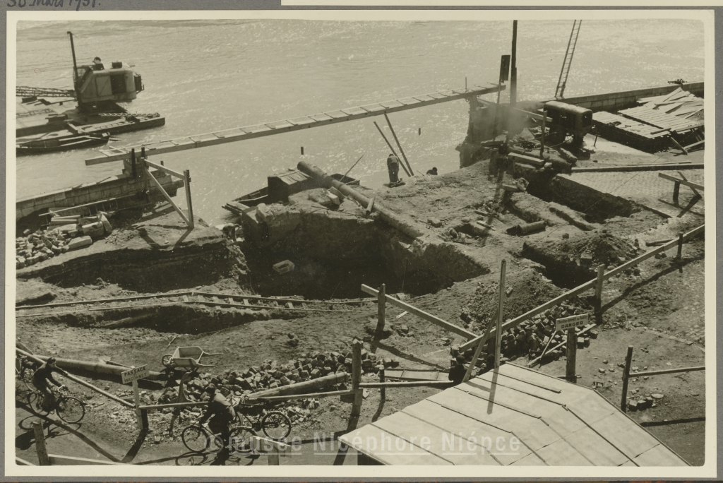Fouilles pour l'établissement des fondations, rive droite, de la culée du nouveau pont Saint-Laurent 30 Mars 1951